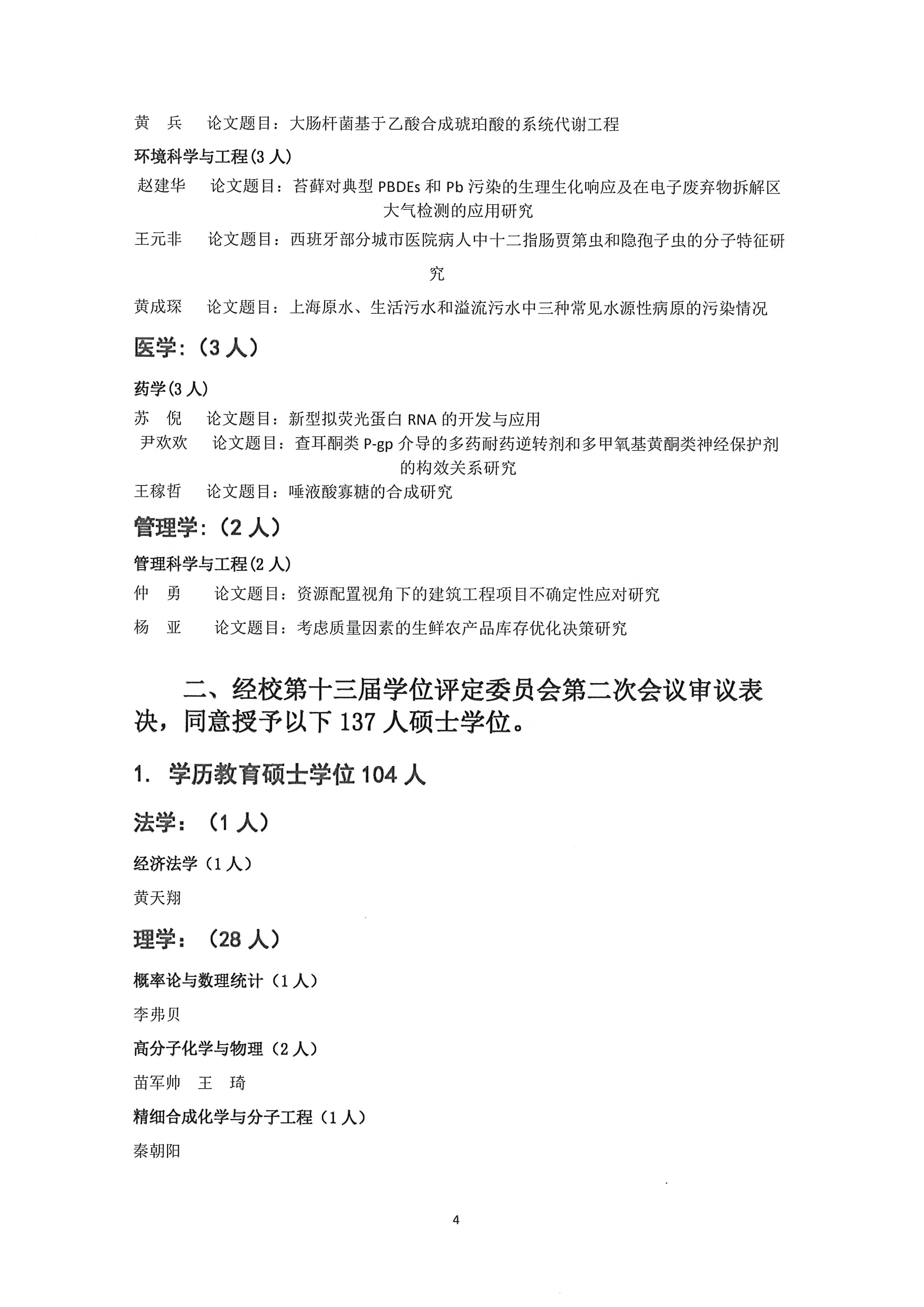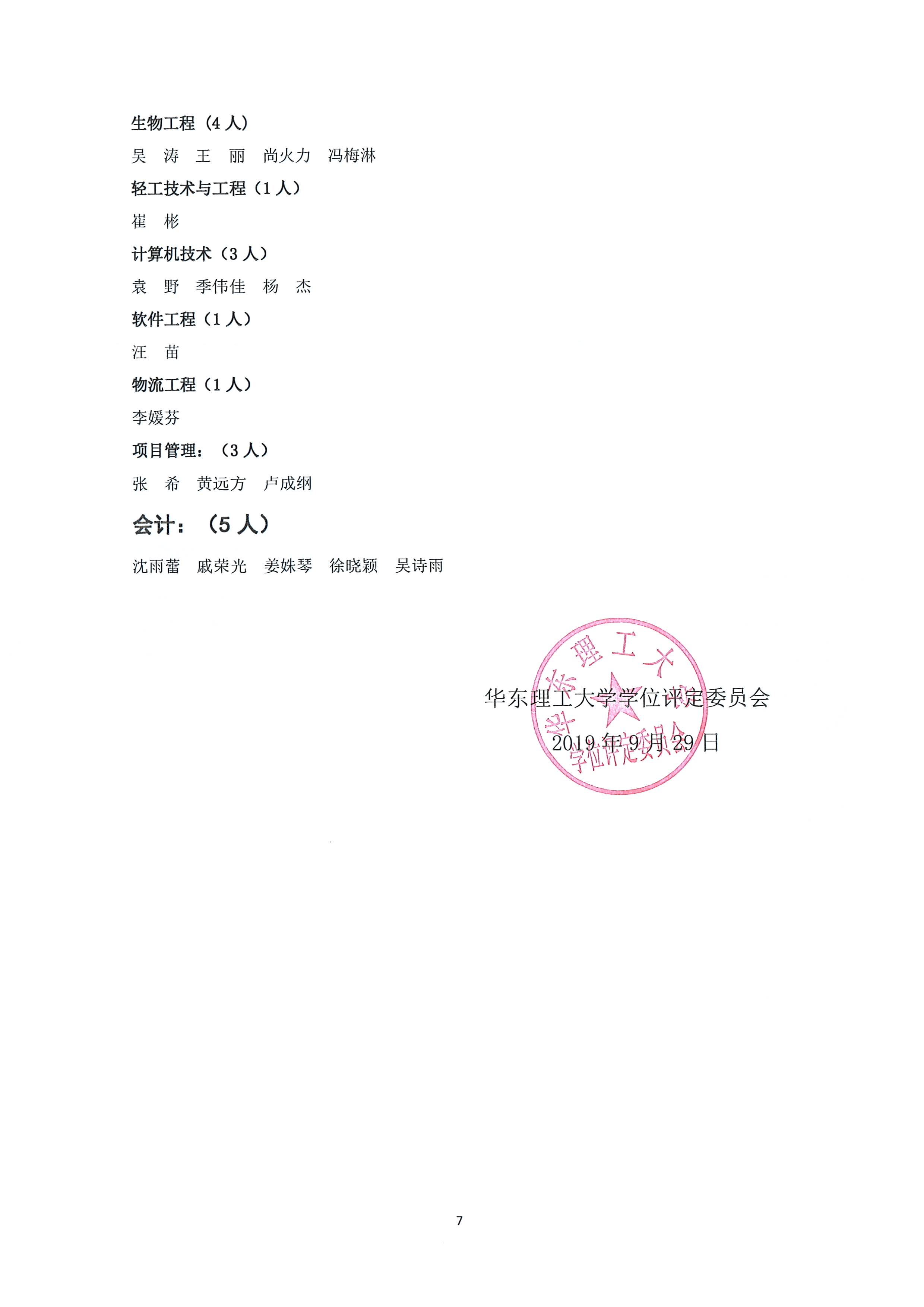华东理工大学第十三届学位评定委员会第二次学位授予公告(2019年3号公告)