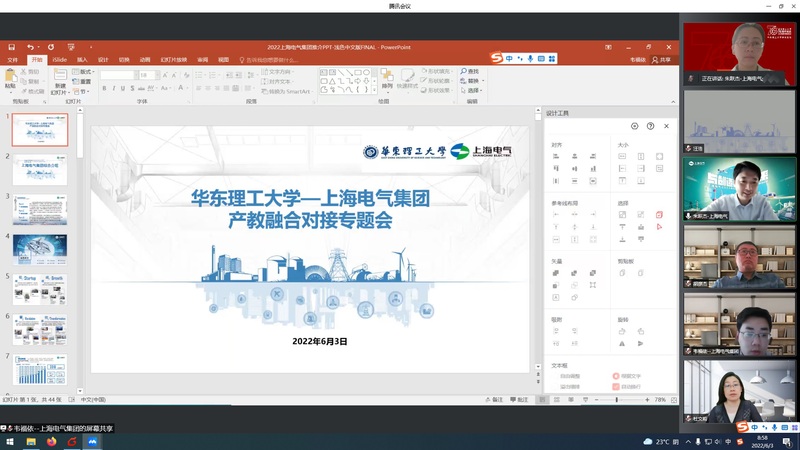 6月3日上午,上海电气集团-华东理工大学产教融合对接专题研讨会在线上召开。上海电气集团股份有限公司科技管理部副部长汪浩博士、人力资源部副部长朱跃杰,我校研究生院院长杜文莉、校长办公室副主任陈啸寅出席了本次会议。