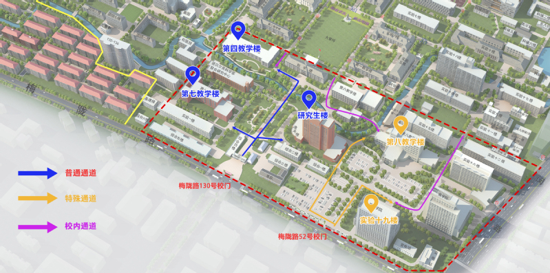 在华东理工大学第四教学楼、第七教学楼、研究生楼参加考试的考生请从华东理工大学梅陇路130号校门进出校园,本校考生可走校内通道。