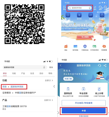 3.扫描下方二维码或在手机银行APP搜索框内输入“国家助学贷款”,进入国家助学贷款页面,点击“申请”/“再次申请”发起贷款申请。