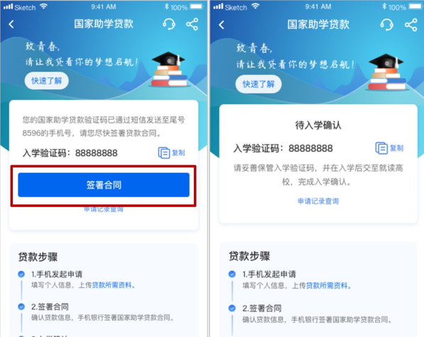 8.贷款申请提交后,需等待学校进行业务初审,学校审核通过后学生将收到8位入学验证码,输入入学验证码后签署贷款合同。