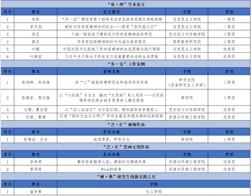 我校研究生院(党委研究生工作部)积极组织师生投稿并择优推荐参评,最终,经个人申报、学校推荐、专家评审和学术检测,共有6篇学术论文、4个工作案例、1部视频作品、2幅绘画作品获奖,1人获评“研究生创新实践之星”荣誉称号。