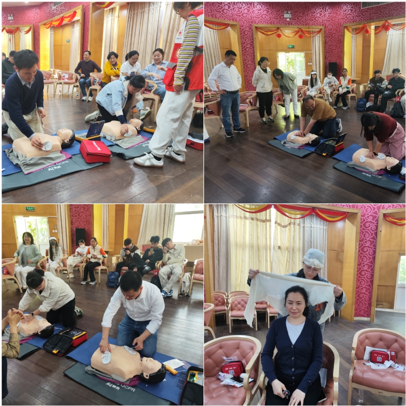 此次培训采用“理论授课+分组实操+现场考核”的模式。培训活动开始,徐汇区红十字会的专业讲师通过生动的图文演示和视频讲解,系统介绍了心肺复苏术(CPR)和自动体外除颤器(AED)的使用方法和操作指南。讲师还重点讲解了气道异物梗阻的识别与处理原则,绷带包扎、三角巾包扎等创伤救护的规范步骤和注意事项。培训过程中,徐汇区红十字会讲师运用经典的案例和详实的数据,使复杂的急救知识变得易于理解、容易上手。