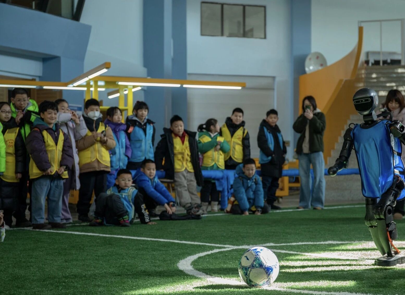 随后,孩子们来到大创工场。机器人精彩的开场舞瞬间点燃氛围,孩子们主动上前与机器人对话聊天,近距离感受人工智能的神奇;组队与机器人展开足球对抗赛,欢声笑语中解锁独家科技体验。